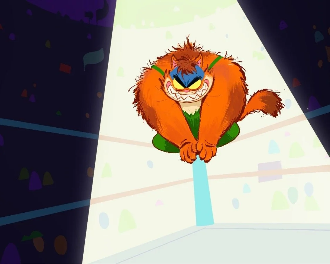 Cartoon character with red fur and green outfit in spotlight on wrestling ring.